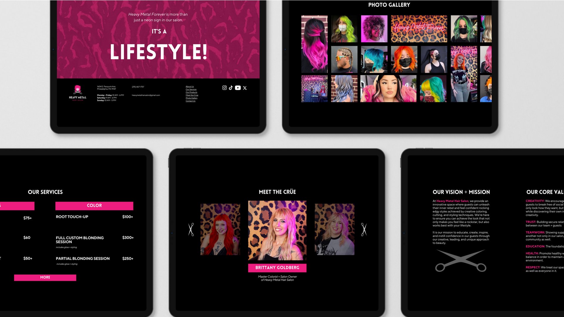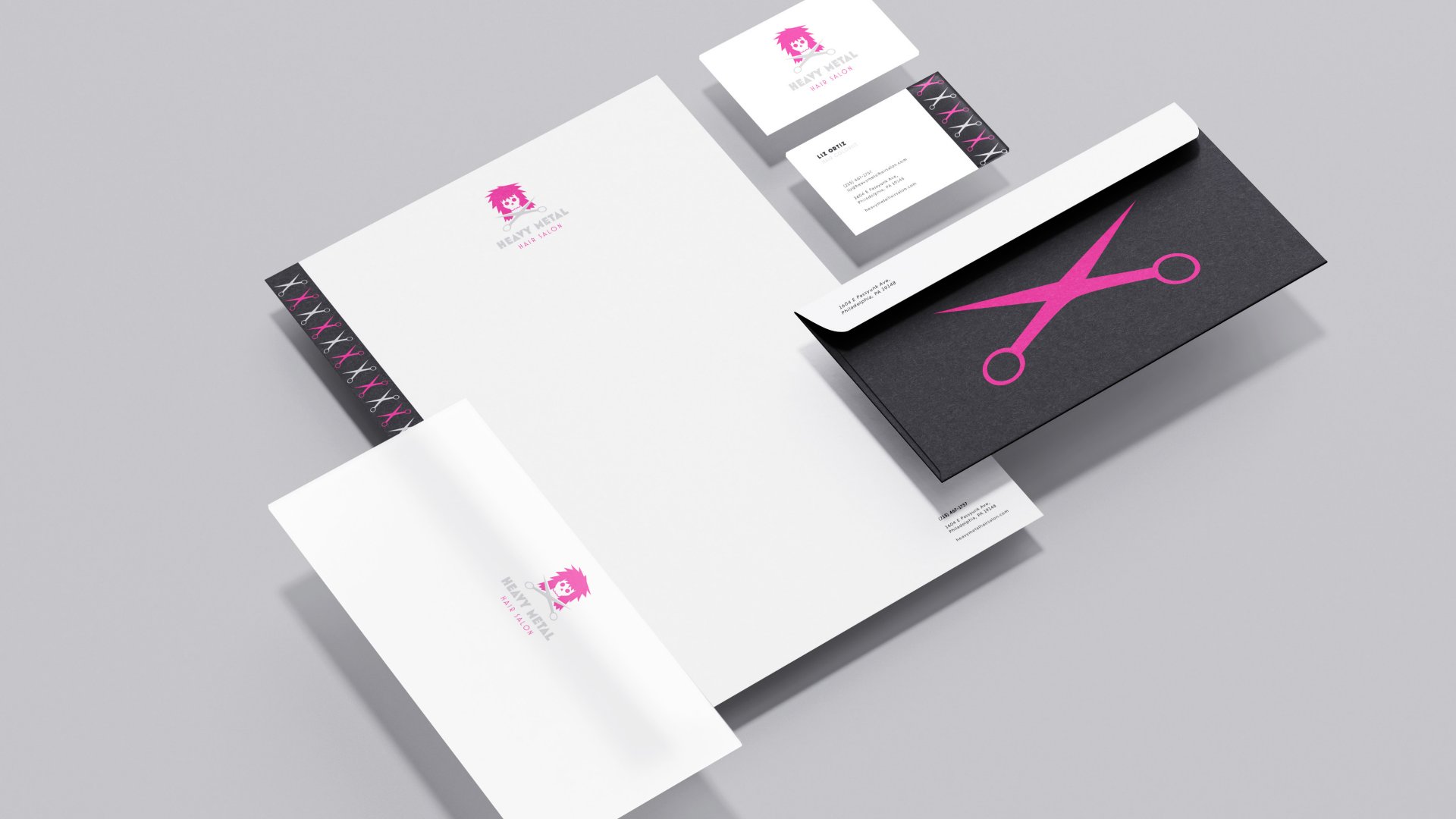 Highlights include a set of dry shampoos with scents named after heavy metal icons, a leather apron and black stylist t-shirts with the logo, a concert ticket-shaped coupon, and a sleek website featuring services, a photo gallery, and team intros. A scissor-patterned stationery set ties it all together.