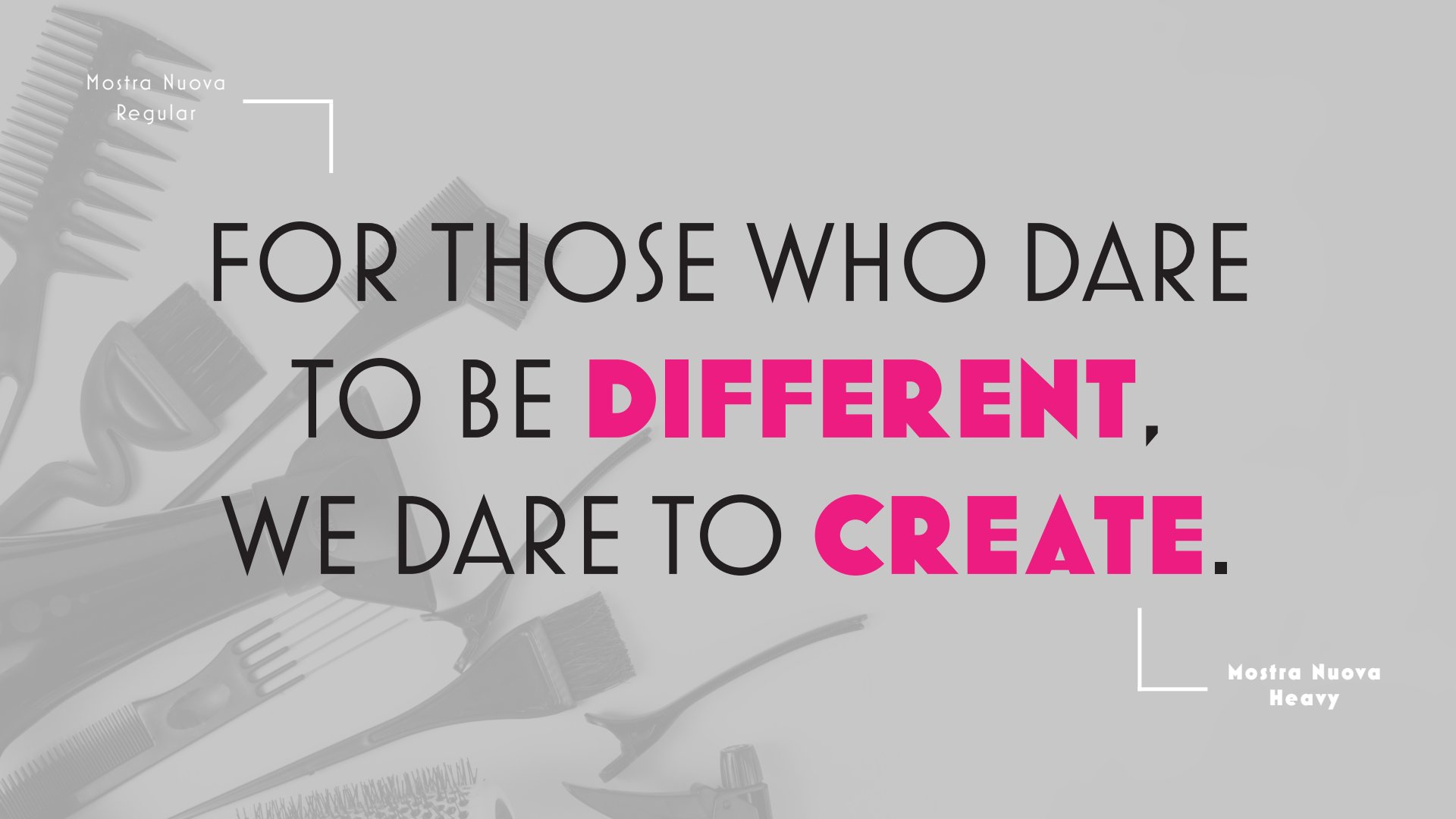 The primary heavy font of the typeface, Mostra Nuova, exudes strength and confidence with its heavy, commanding presence, while its secondary regular font adds a refined, contemporary touch. Together, they create a dynamic and cohesive visual language that mirrors the salon’s edgy, rock inspired vibe.