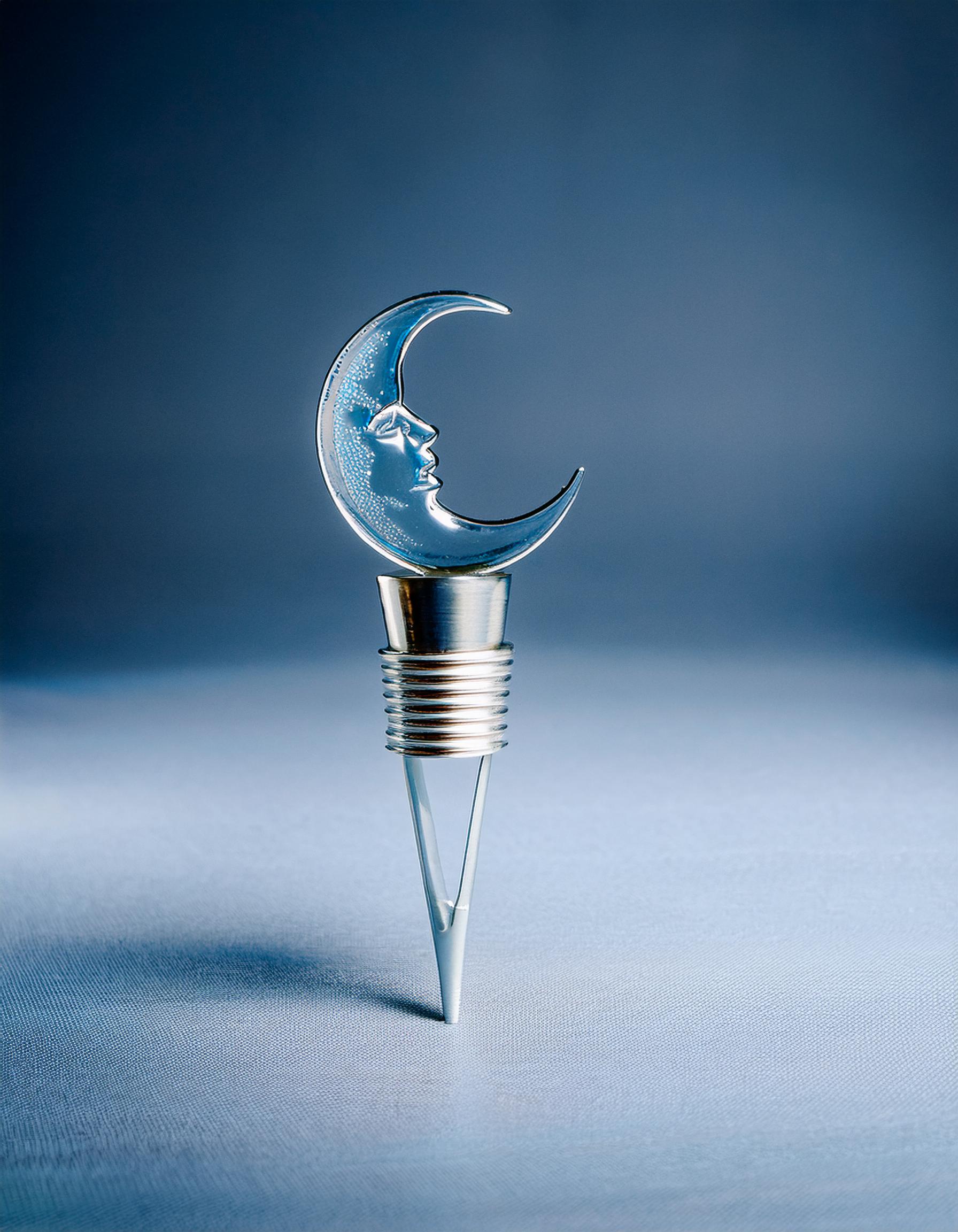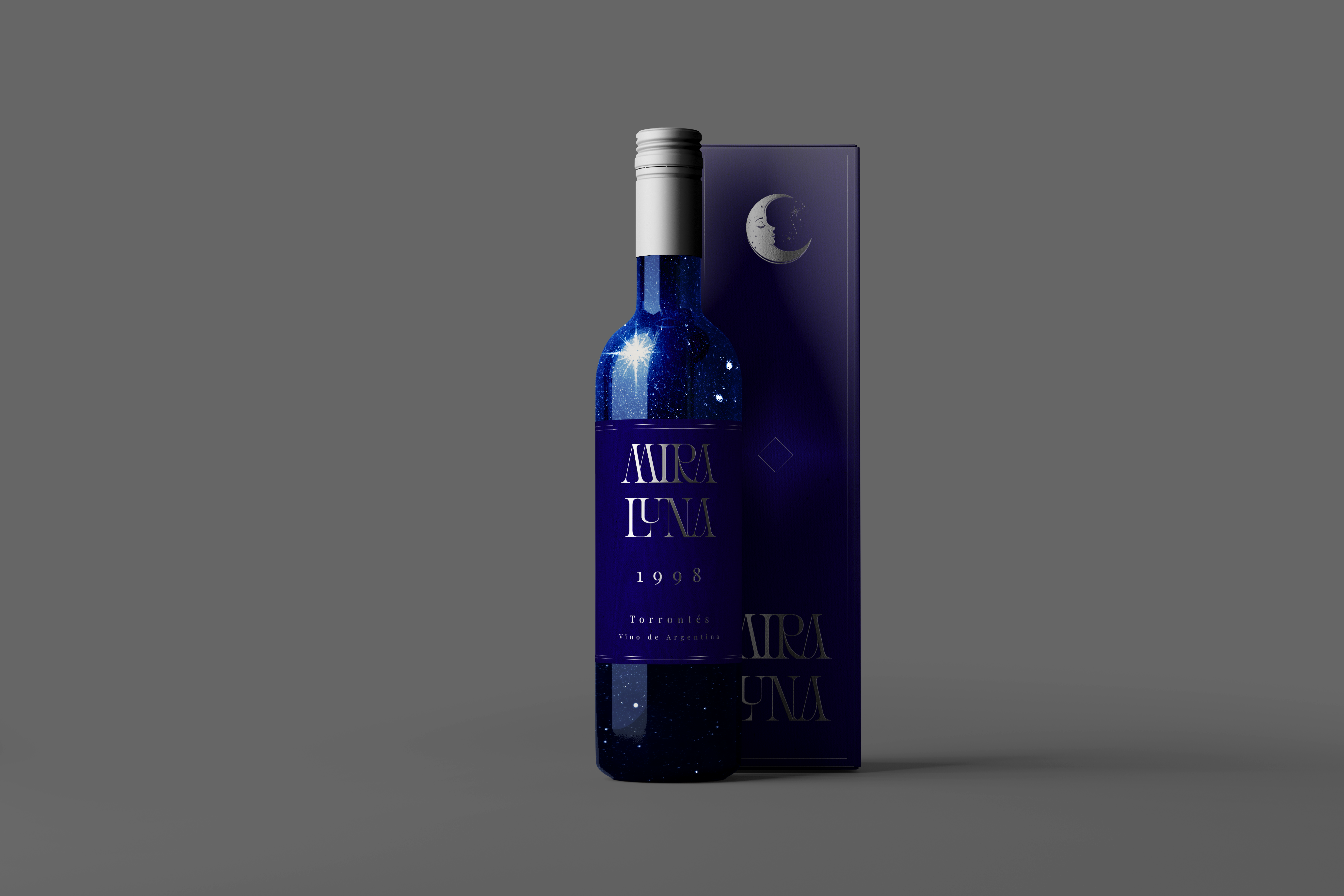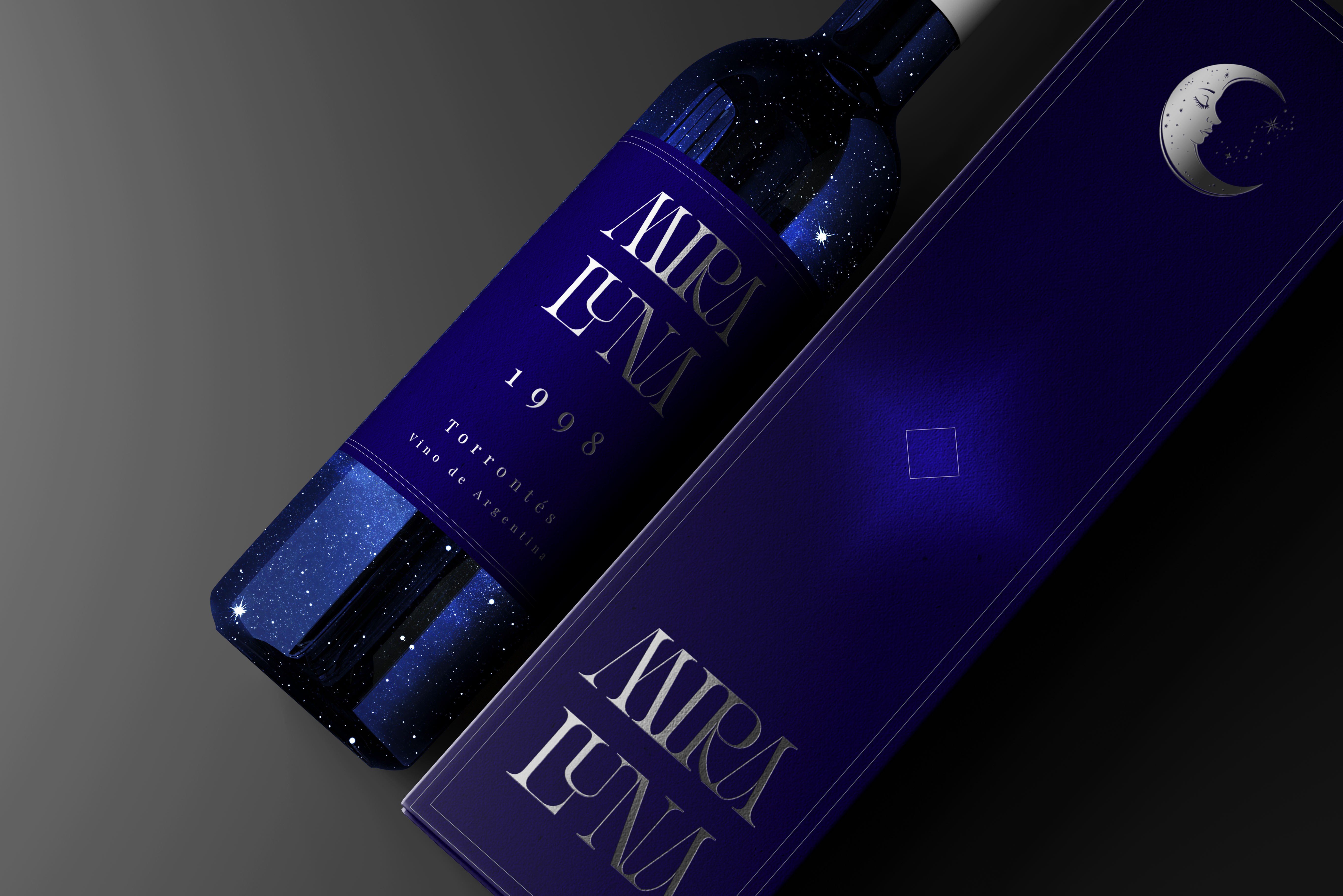 The Graphis award-winning packaging design features a bottle wrapped in a starry night pattern and a royal blue label showcasing its Argentine origins. The navy box, with a diamond gradient and crescent moon accents, pairs beautifully with the frosted glass wine stopper, crafted with a half-metal, half-glass base. Subtle silver borders complete the luxurious design.