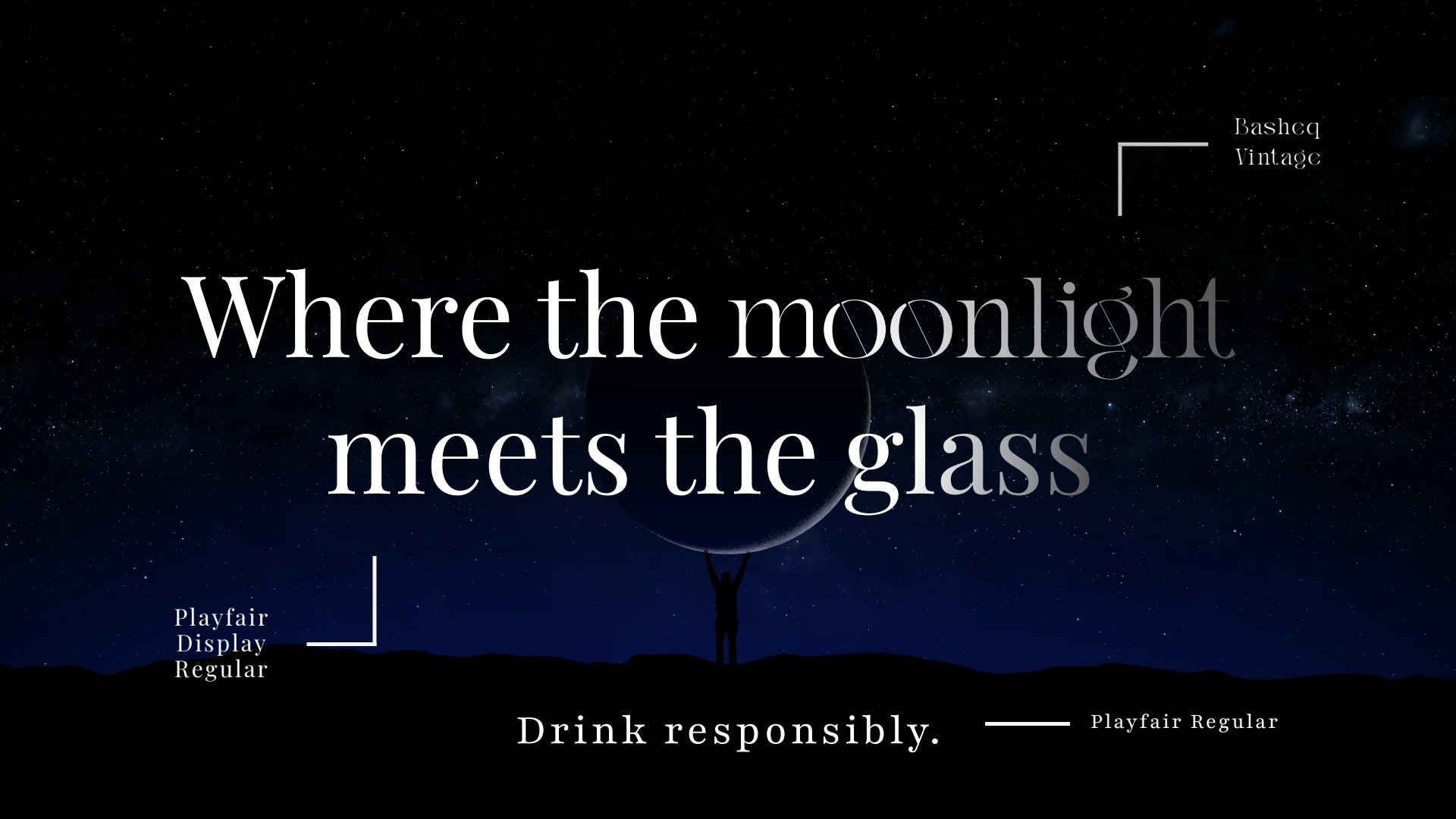 Basheq Vintage, the primary typeface, exudes modern luxury with its bold, graceful design. Playfair, the secondary typeface, adds a softer, traditional touch, balancing elegance and versatility. Together, they reflect the brand’s inspiration from the moon’s beauty and the art of winemaking.